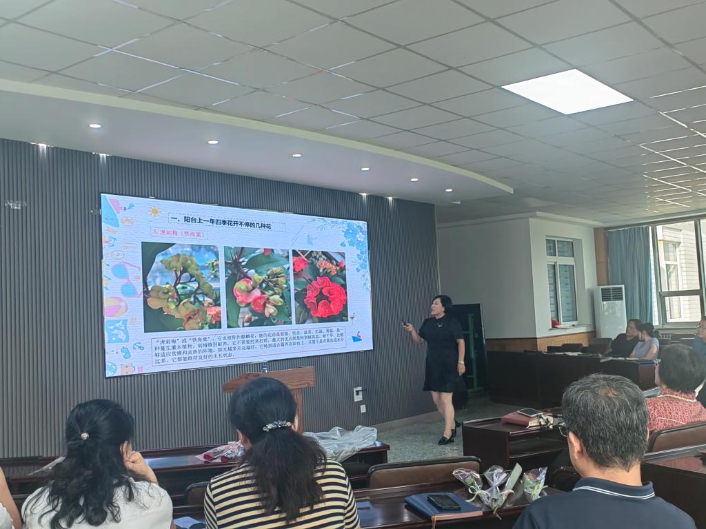 王文荣教授以“养花不仅是培育植物,更是与自然对话、滋养心灵的过程”为引,瞬间拉近了与在场教职工的距离。结合自身多年养花经验,她围绕“不同场景下的花卉选择”“养花实用技巧”两大核心板块展开分享,内容兼具科学性与实操性,贴合教职工家庭养花的实际需求。在“场景化选花”环节,王文荣教授针对教职工常见的养花场景,分类推荐了适配花卉。对于追求“阳台四季有花赏”的教职工,她详细介绍了龙船花、龙吐珠、蓝雪花等12种花卉的特性:针对洗手间、北窗台等光照较弱的环境,她推荐了白掌、秋海棠、如意皇后等花卉;对于拥有庭院或露台的教职工,她则分享了月季、风雨兰、耧斗菜等适合露天养护的花卉。除了花卉选择外,王文荣教授还聚焦养花过程中的“痛点”,分享了一系列实用技巧。